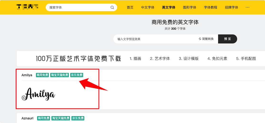 首先点击到英文字体类,点击免费商用标签,第一个就是这个“Amilya”字体,上面标记的是“免费商用”。