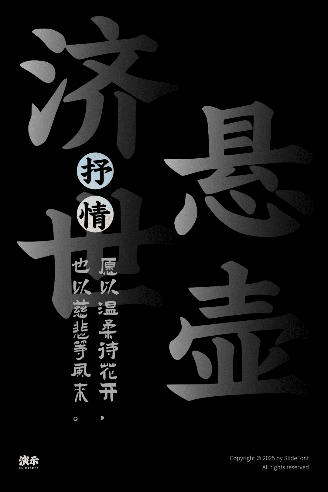 同时演示字体也采用业内最简单的授权方式。一次授权,即可终身使用演示字库的全部字体,不限用途、不限曝光量,无需再为字体版权支付额外费用。讨厌玩套路,真诚做字,兼具“用的起”和“超预期”体验。我方出售的字体不区分企业版与个人版,采用同价销售方式,让客户放心用字。堪称字体行业的良心典范!