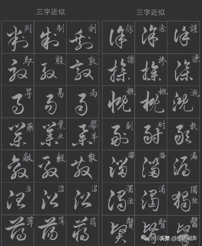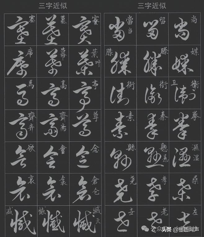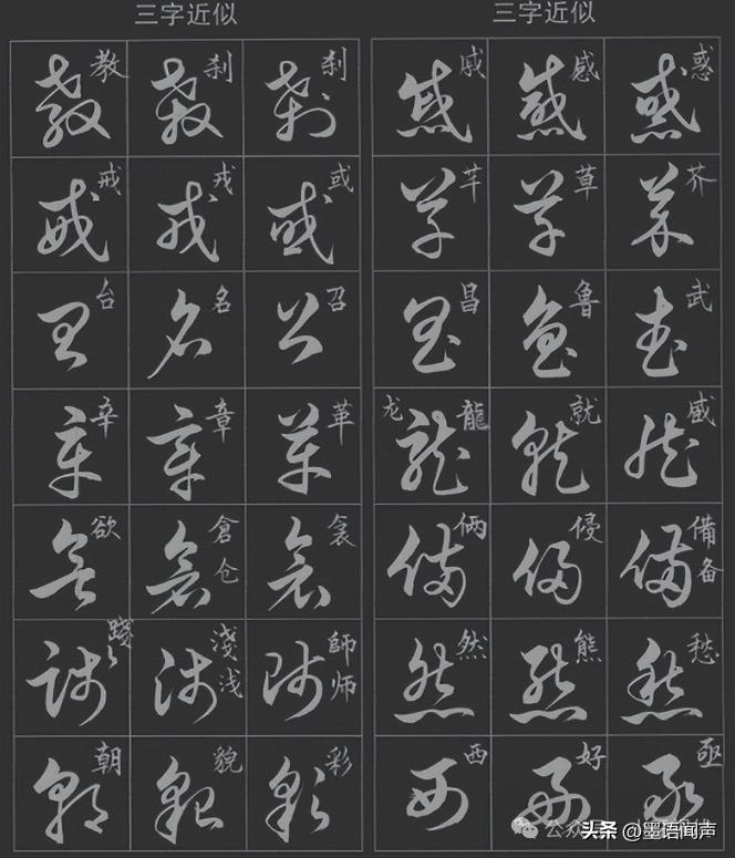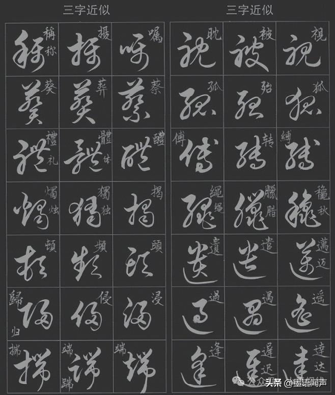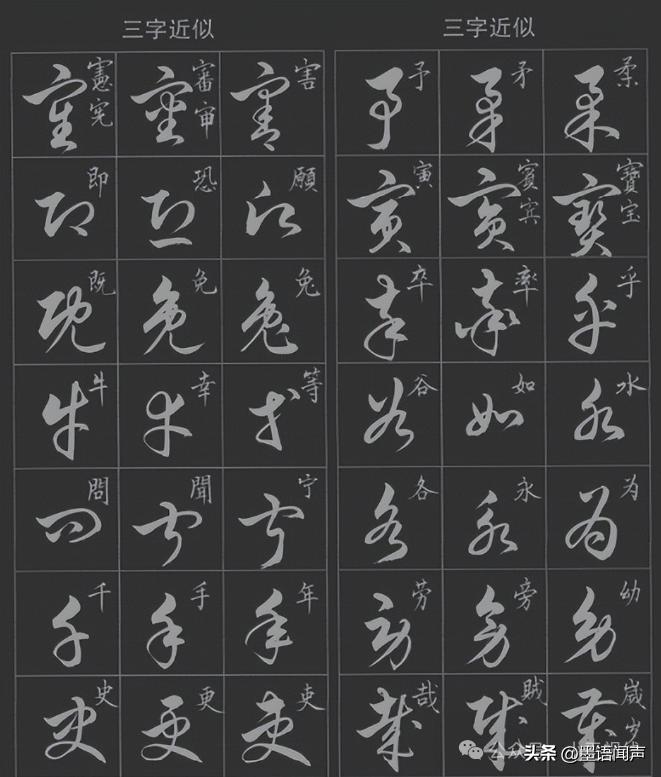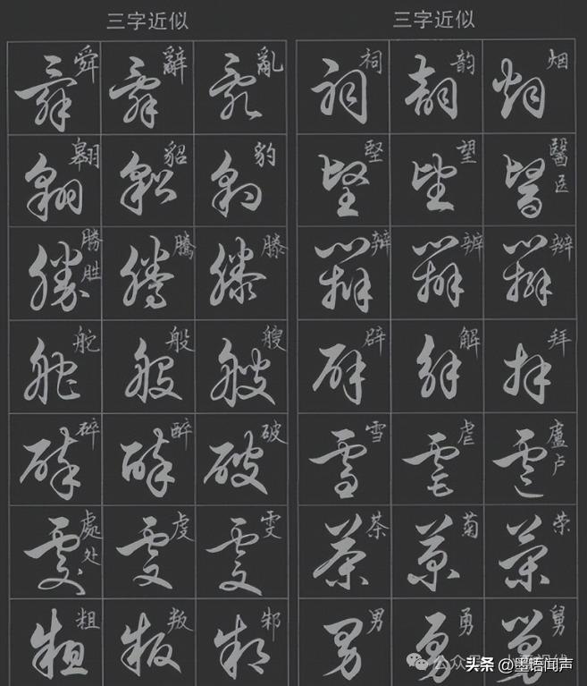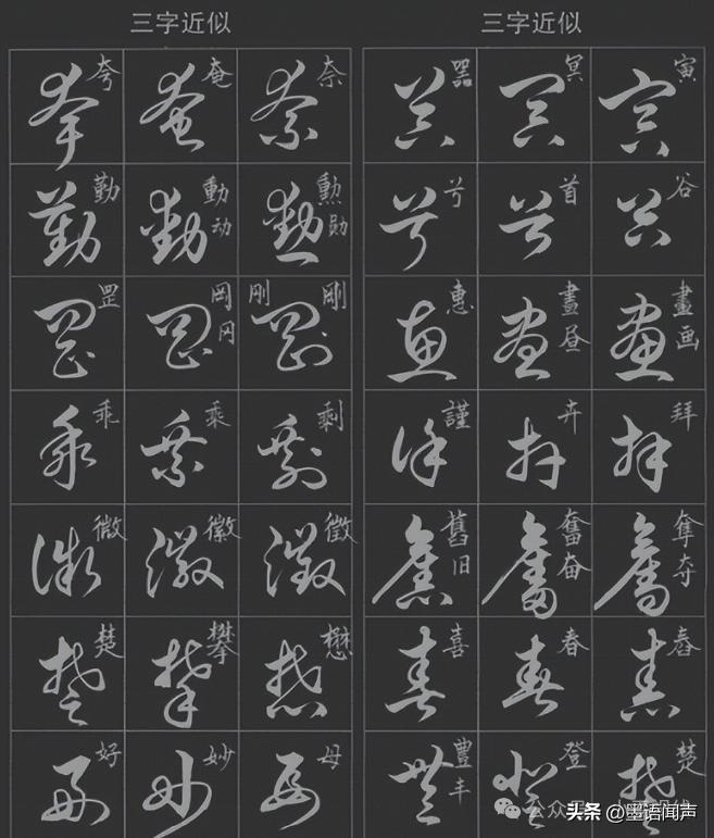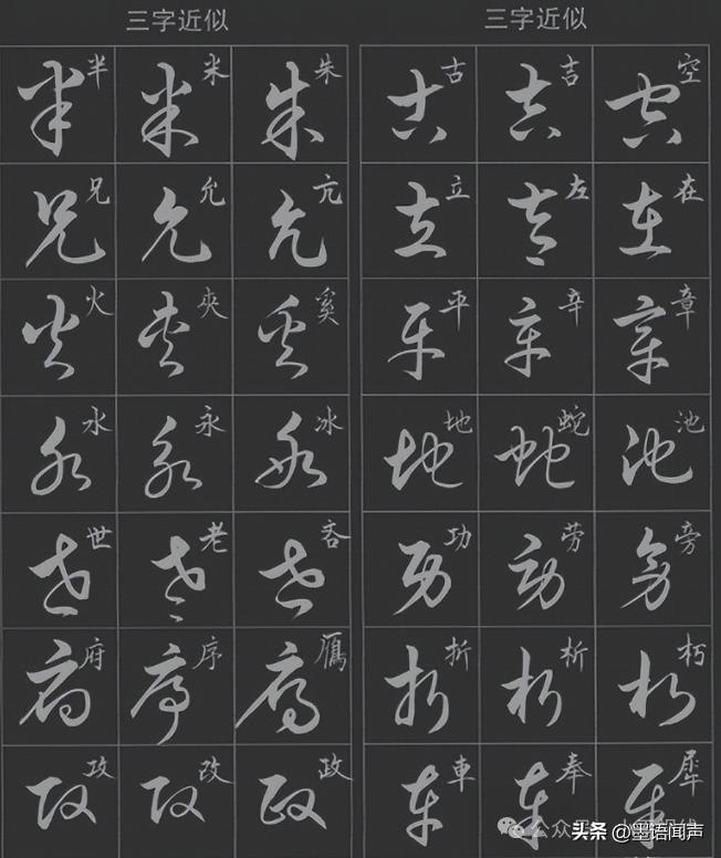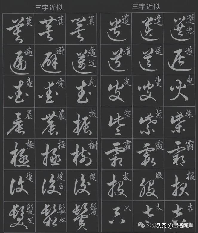 草书中许多字因简化或连笔导致形态相似,易混淆。需通过对比、联想和系统归纳来掌握。