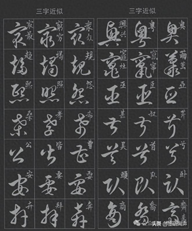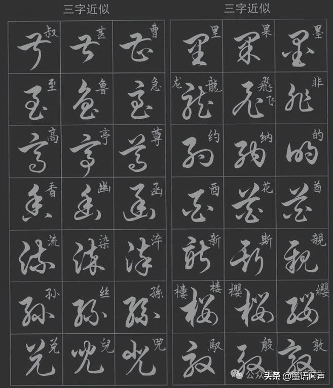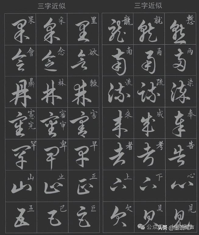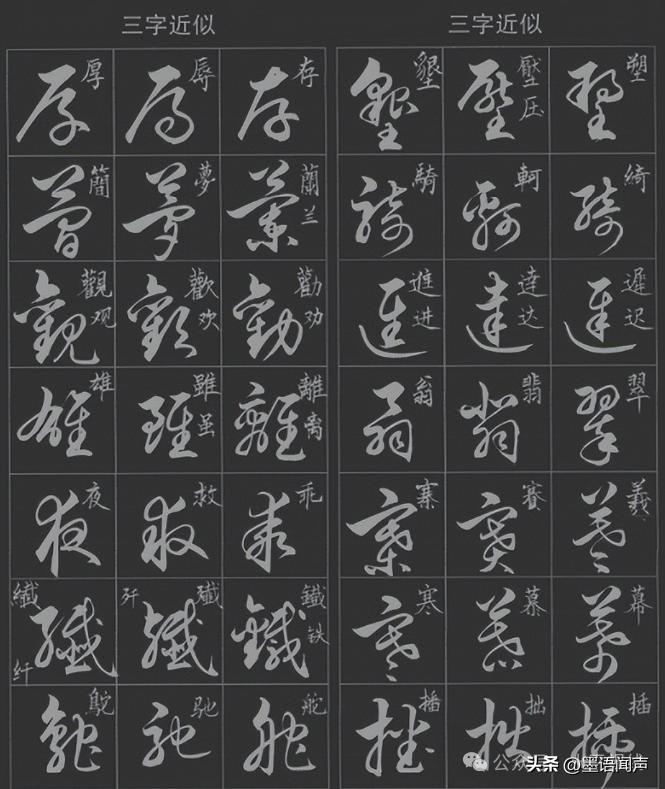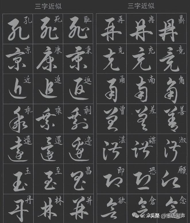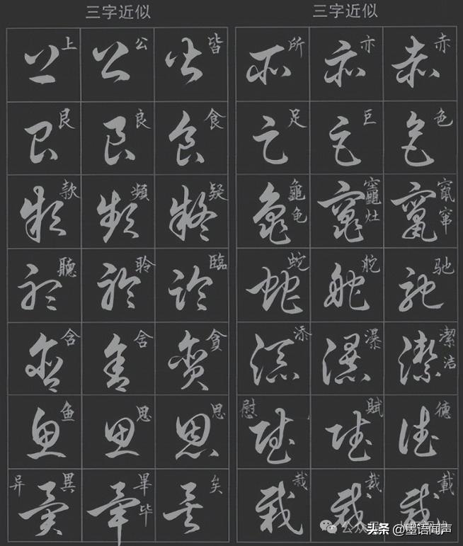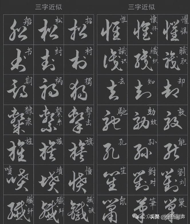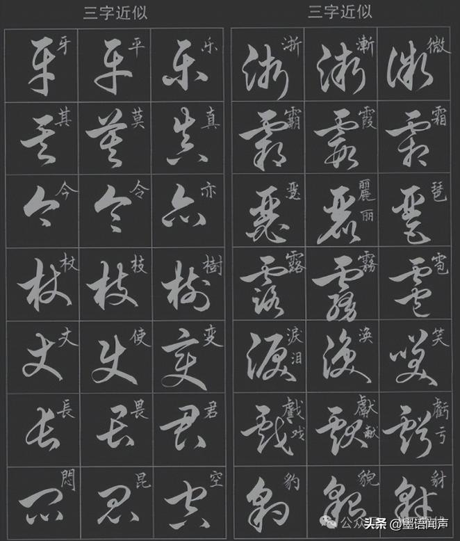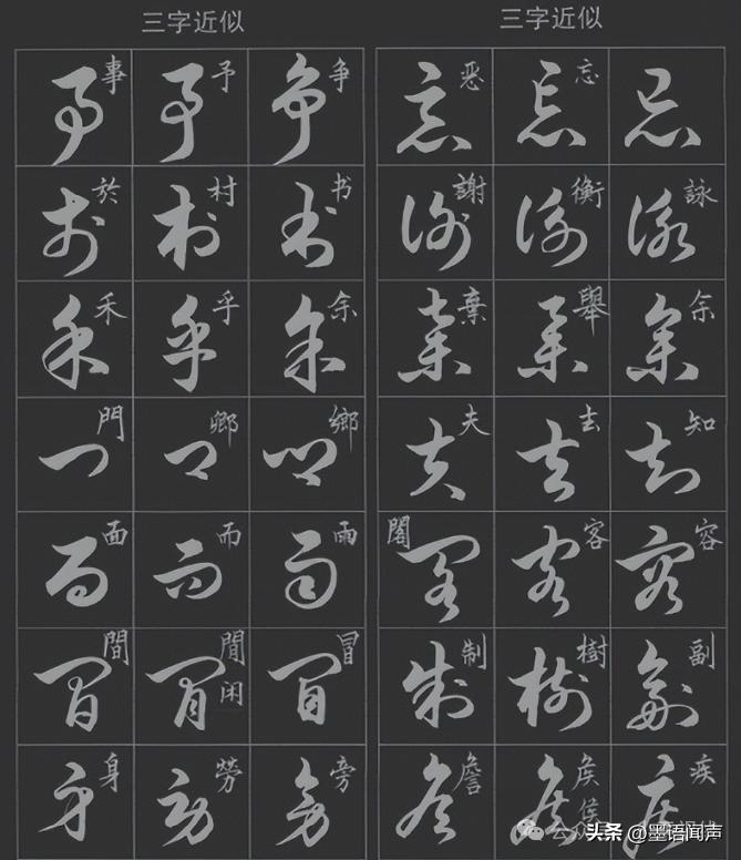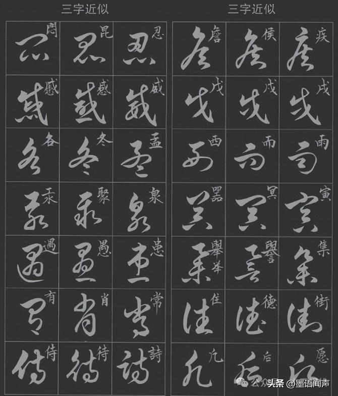 草书中许多字因简化或连笔导致形态相似,易混淆。需通过对比、联想和系统归纳来掌握。